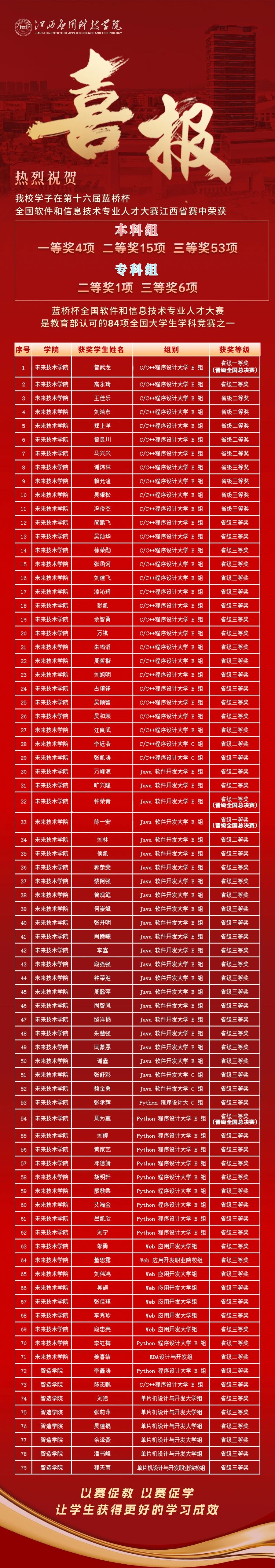 近日,学校在第十六届蓝桥杯全国软件和信息技术专业人才大赛省赛中,共斩获79项奖项,其中本科组一等奖4项、二等奖15项、三等奖53项;专科组二等奖1项、三等奖6项。按照大赛规则,学校曾武龙、钟荣青、陈一安、周为嘉4名同学成绩优异,将代表学校参加全国总决赛。