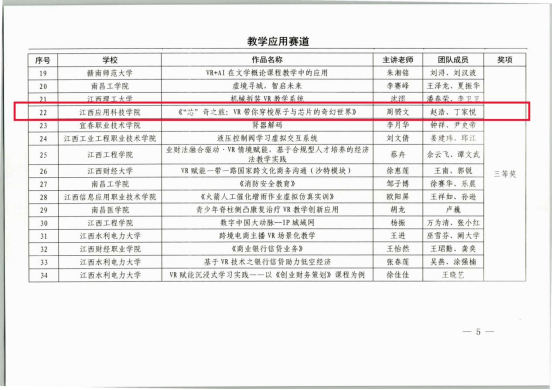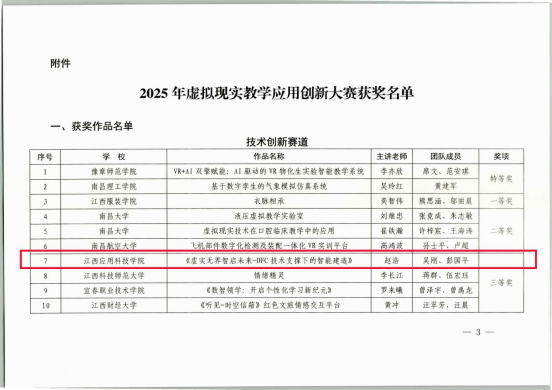 由江西省教育厅、江西省工业和信息化厅、南昌市人民政府联合举办的2025年虚拟现实教学应用创新大赛结果公布。我校建筑学院赵浩老师团队的作品《虚实无界智启未来-DFC技术支撑下的智能建造》荣获“技术创新赛道”三等奖,周赟文老师团队的作品《“芯”奇之旅:VR带你穿梭原子与芯片的奇幻世界》荣获“教学应用赛道”三等奖,我校获评“优秀组织奖”。