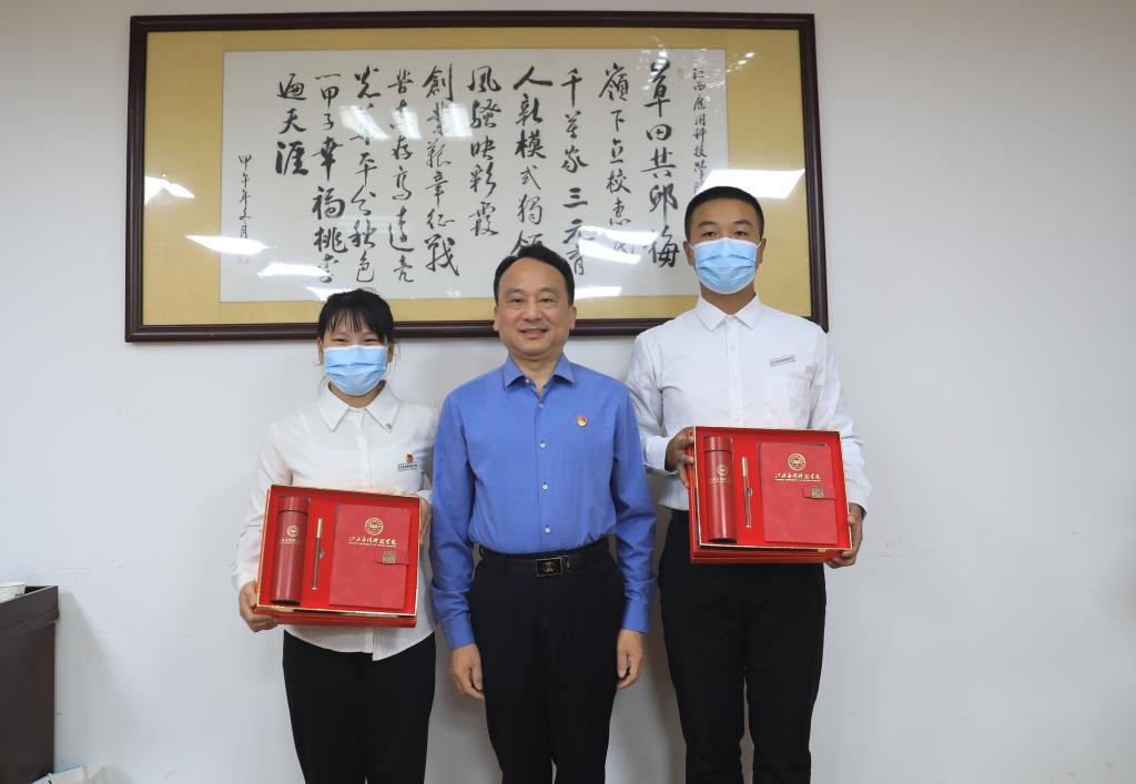 会前,党委书记彭迪云为勇救落水儿童的邓文锋和吴华珍两位同学颁奖。