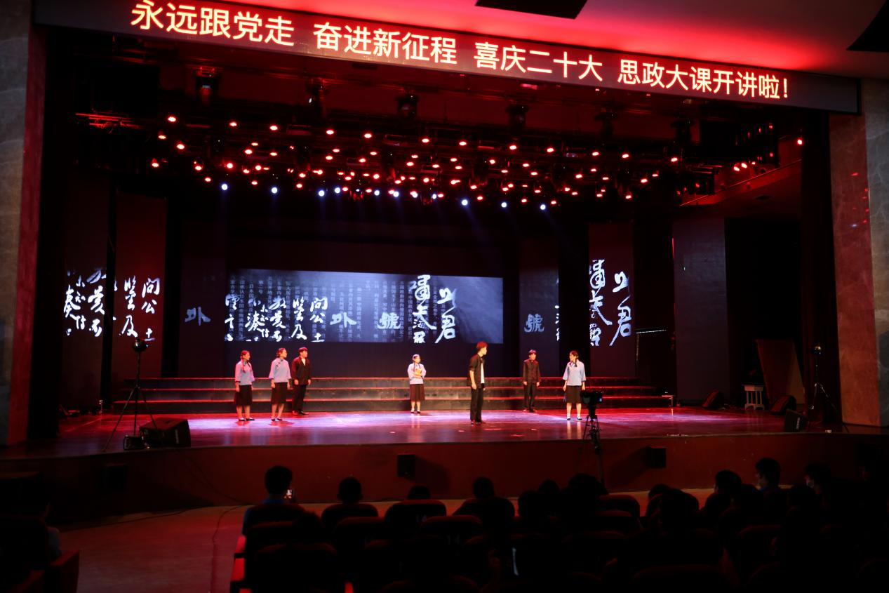 此次思政大课一改以往思政课“老师讲、学生听”的传统模式。课前,学生在老师的指导下策划、编排《风暴》《长征》《三湾改编》等多部舞台情景剧。青年教师通过选题、试课、打磨,最后和同学们一起走上舞台深情演绎。通过老师的讲,学生的演,色彩绚烂的舞台变成了思想政治课的讲台,自编自演情景剧本变成了生动的红色教材,师生同台共同打造了一场生动的“艺术思政课”。