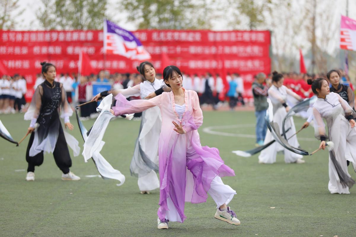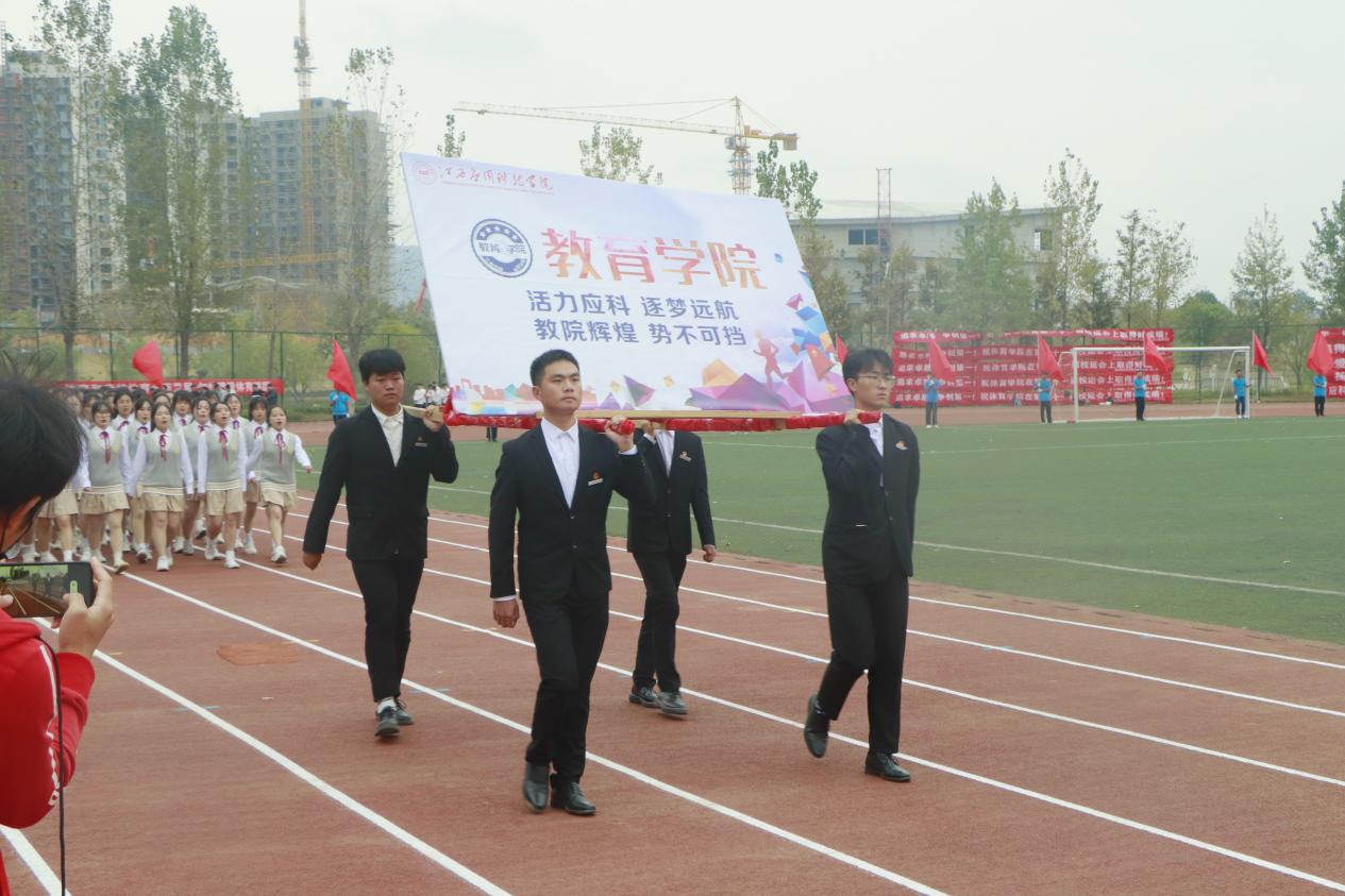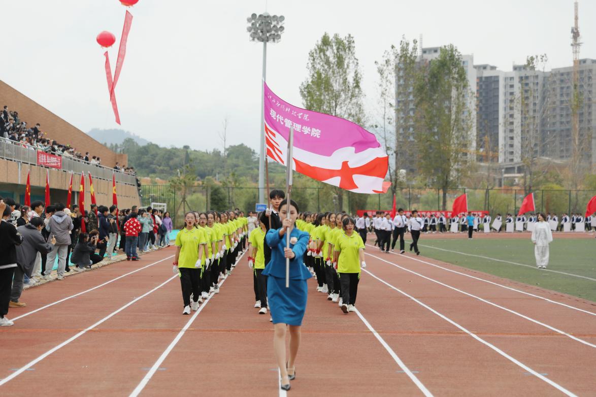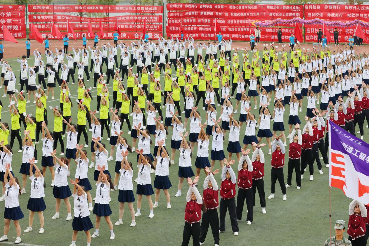 开幕式上,英姿飒爽的国旗校旗会徽仪仗队伴随着慷慨激昂的《运动员进行曲》昂首阔步率先入场,他们满怀热爱与荣光从新征程中走来,动作整齐划一、神情严肃认真,展现出新时代青年的浩然正气。五星红旗在运动场冉冉升起、迎风飘扬,运动员代表和裁判员代表分别宣誓。各学院和机关方阵队喊着响亮的口号,迈着坚定矫健的步伐有序入场,各方阵表演精彩纷呈。现代管理学院的同学们结合自身专业特色融合中国古典舞蹈与现代舞蹈,教育学院的学生们以优美身姿展示古典舞《折枝花满衣》,音乐学院学子百人大型音诗舞情景表演《领航》深情献礼党的二十大。全体运动员参加的广播体操表演,动作整齐划一,身姿优美舒展,充分展现了青年学子昂扬向上的精神风貌。