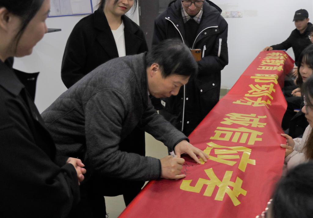 在讲课前,黄士安带头在诚信考试的横幅上写上自己的名字,随后讲授《诚信》专题思政课