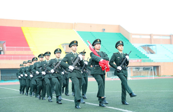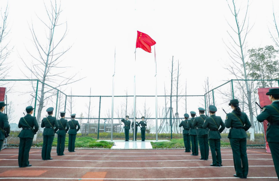 晨露未晞,在清晨第一束阳光的映照下,学校教官队迈着整齐铿锵的步伐,师生齐唱国歌,行注目礼,鲜艳的五星红旗冉冉升起,高高飘扬。