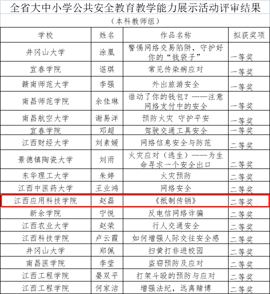 近日,由江西省教育厅举办的2022全省大中小学公共安全教育骨干教师教学能力展示活动结果出炉,共评选出一等奖41项、二等奖71项、三等奖100项。其中,我校国际商务学院教师在此次大赛中荣获二等奖。
