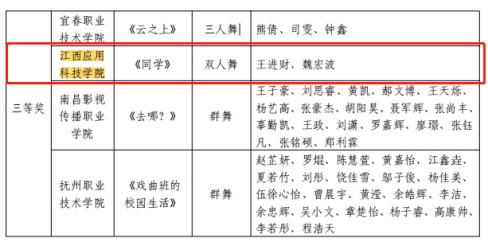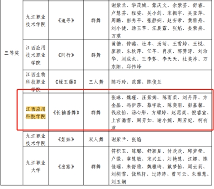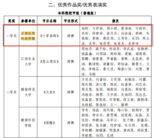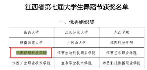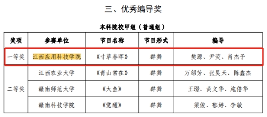 近日,省文联、教育厅联合发布《关于公布江西省第七届大学生舞蹈节获奖名单的通知》我校在此赛事中成绩斐然,喜获一等奖2项(全省9项)、二等1项、三等2项、优秀编导奖3项及优秀组织奖等9项荣誉。
