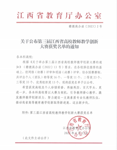 近日,江西省教育厅公布了第三届江西省高校教师教学创新大赛获奖名单,我校教师在第三届江西省高校教师教学创新大赛中荣获佳绩。赵磊主讲的《跨电子商务基础与实务》获得新文科中级及以下组三等奖。