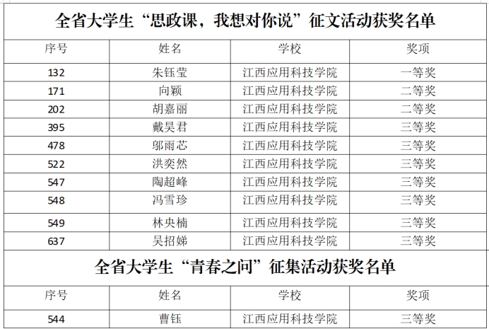近日,江西省教育厅公布江西省大学生“思政课,我想对你说”征文和“青春之问”征集活动获奖名单,江西应用科技学院在“思政课,我想对你说”征文活动中获一等奖1个、二等奖2个、三等奖7个,“青春之问”征集活动中获三等奖1个。