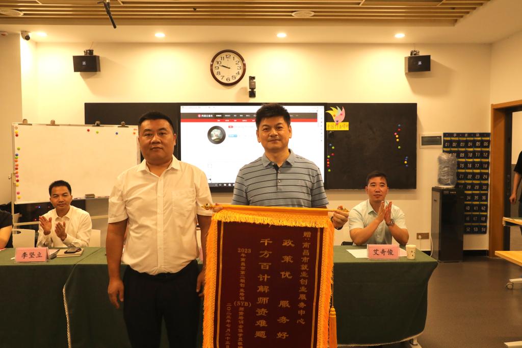 此次培训评选出一批优秀学员,由李坚立宣读优秀学员获奖名单,分别邀请刘涛和李文军给学员颁奖。同时,学员代表给市就创中心赠送锦旗。