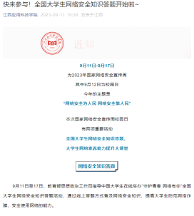 网络答题,提高认识。我校积极响应学校关于网络安全教育宣传周的活动通知,组织全体学生积极参与大学生网络安全知识竞赛,引导全体教职工主动学习网络安全知识,强调了网络安全教育的重要性,提升了师生们的网络安全意识和基本技能,营造网络安全人人有责、人人参与的良好的氛围,让网络安全教育的理念深入人心。