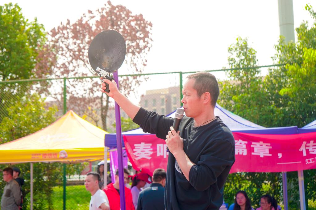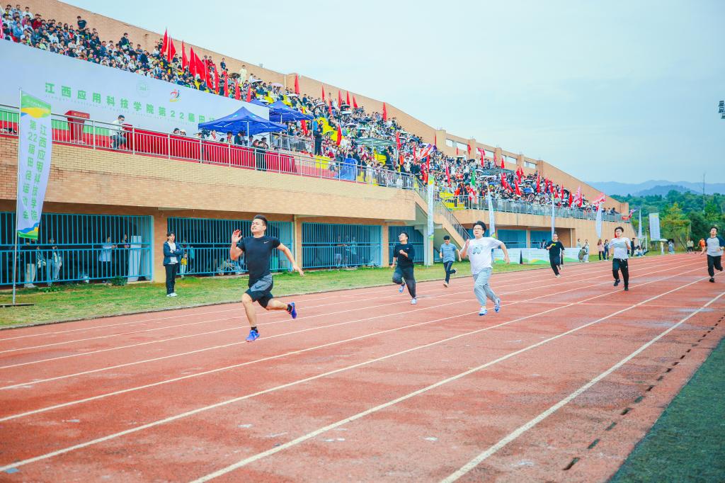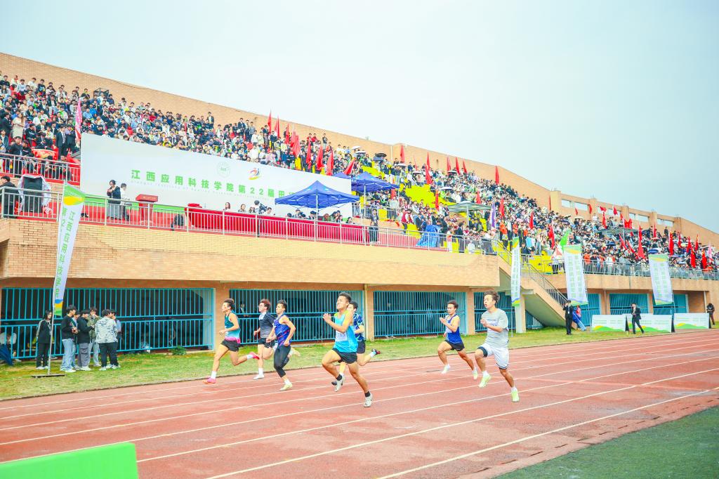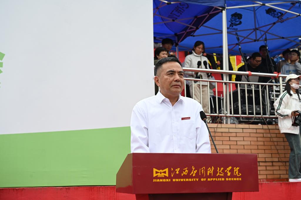 江作军在开幕式上讲话。他指出,一年一度的校田径运动会是为了贯彻落实习近平总书记关于教育的重要论述和中共中央、国务院《关于全面加强和改进新时代学校体育工作的意见》等文件精神的综合体现,也是对我校体育工作、师生精神风貌的一次检阅。通过全体师生的共同努力,近五年来,学校体育教学水平、竞技水平、体育教学改革、群众性体育活动都取得了明显进步。学校在各级各类比赛中取得了丰硕成果,多次获得江西省大学生篮球比赛冠军;获得江西省大学生足球比赛获五连冠;获得江西省大学生运动会田径比赛获十多个单项冠军,三个单项破省纪录;获得江西省大学生国际标准舞冠军3项;在2022年江西省第十六届运动会比赛中获得17金11银11铜的好成绩,位列同类院校第一名。这些成绩的取得离不开学校广泛的群众性体育与竞技体育活动的开展。