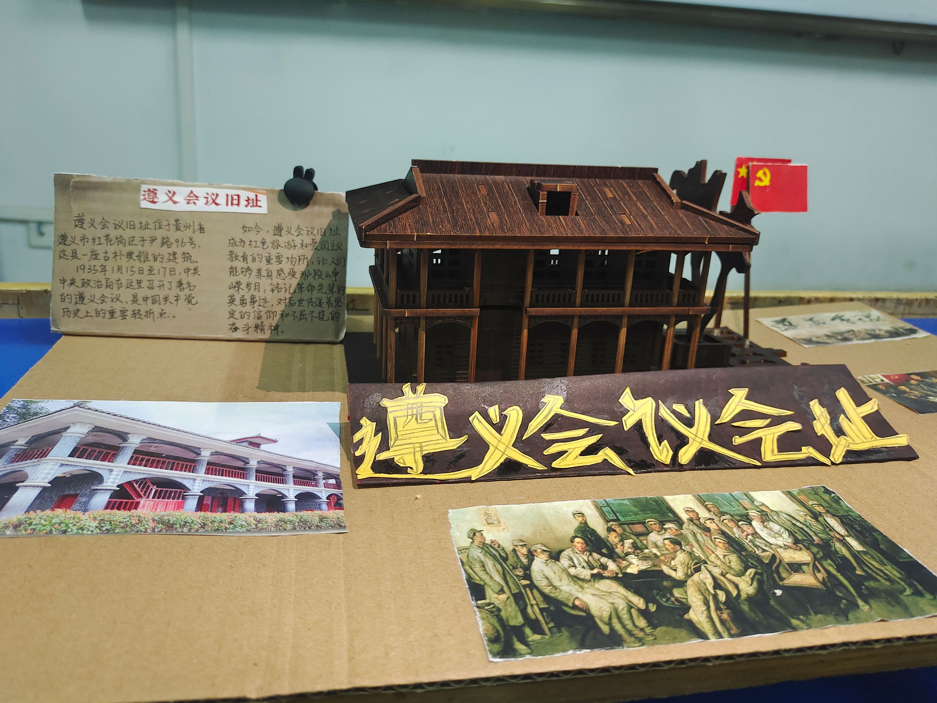《遵义会议》创意手工作品是“红色走读”团队同学感悟“遵义会议精神”,以严谨的态度和对历史的敬畏,将500余根棕色木棒精心设计、耐心拼接成遵义会议旧址。模型中的每一个细节都凝聚着青年对革命先辈的敬仰之情,不仅完美诠释了工匠精神,还将 “遵义会议精神”实践化和形象化。《遵义会议》制作的过程不仅让新时代青年理解了遵义会议作为党生死攸关的转折点的重要意义,又使得新时代青年深刻领悟了“坚定信念、实事求是、独立自主、敢闯新路”的遵义会议精神。