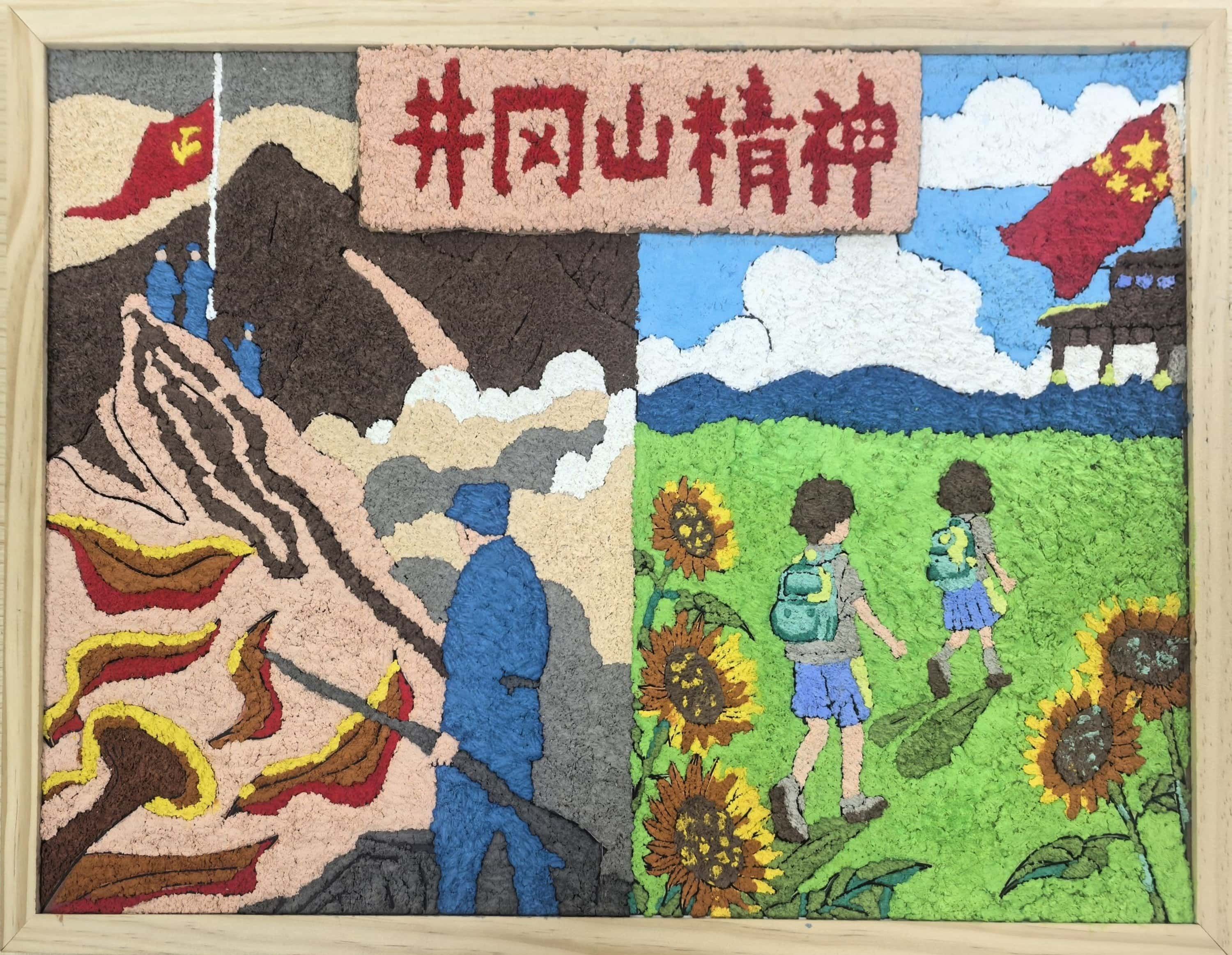 成员们通过云游的方式,被井冈山的历史故事和革命精神深深打动。他们看到了革命先辈们如何在艰难困苦中坚持斗争,如何以坚定的信念和无私的奉献,为中国的独立和人民的解放事业奋斗终身。特此,成员们制作了一幅纸浆画来纪念井冈山精神。