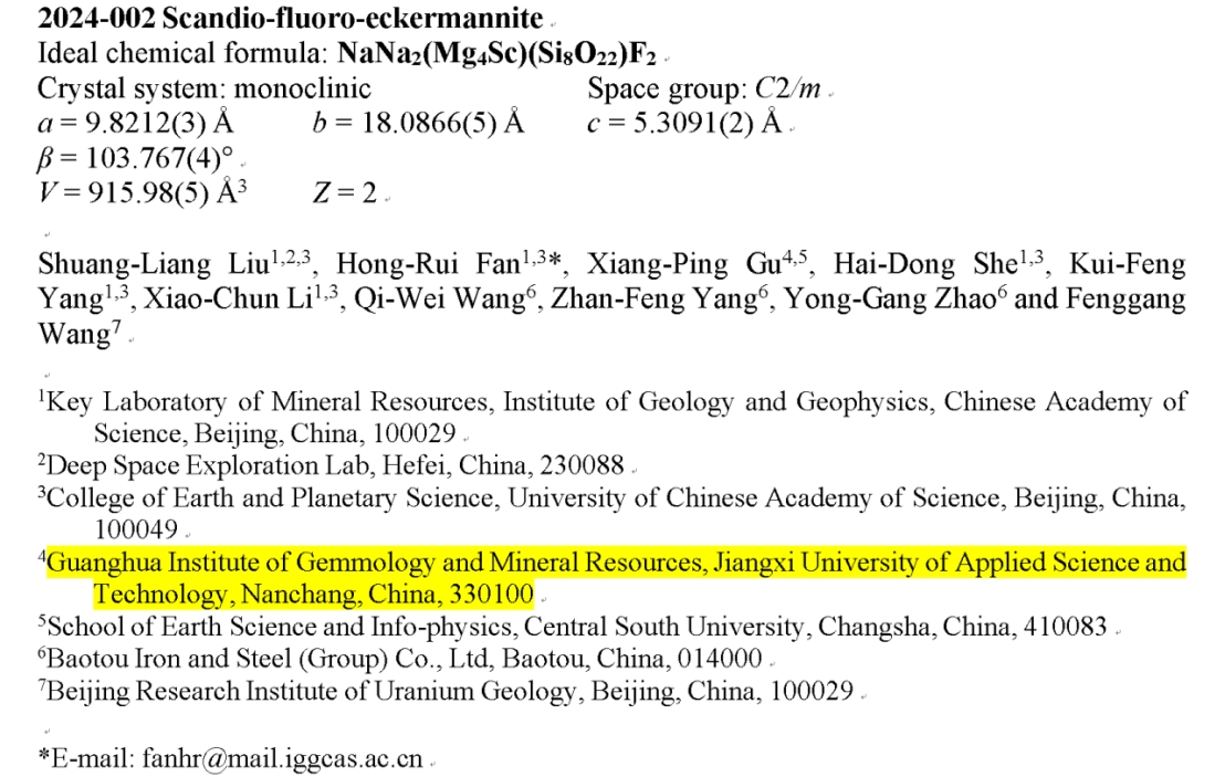 紧随其后,6月3日,由江西应用科技学院科研人员与中国科学院地质与地球物理研究所、包钢(集团)公司、包头稀土研究院等单位的科研团队共同发现,并申报的新矿物—翟钪闪石,也获得国际矿物协会新矿物命名与分类委员会(IMA-CNMNC)的批准,为中国矿物学研究和稀土矿物资源开发作出了重大贡献。其中文名—翟钪闪石以表彰中国科学院翟明国院士的科学贡献,彰显了我校矿物学家与国家研究团队间紧密合作、共同进步的精神风貌。
