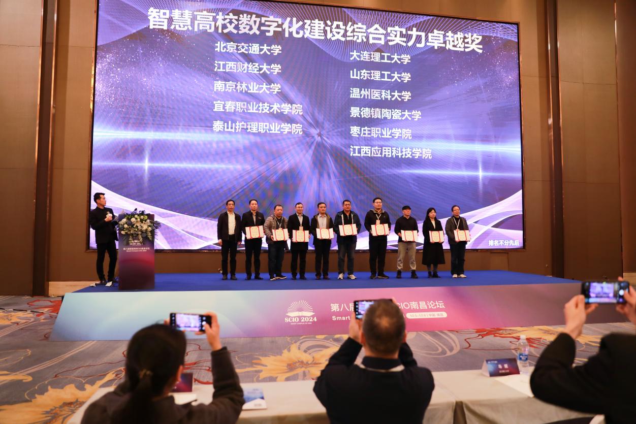 我校受邀参会并获“智慧高校数字化建设综合实力卓越奖”荣誉称号。副校长谢远健代表学校参会,网络信息中心主任刘宇中登台领奖。