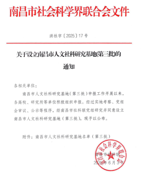 近日,南昌市社联下发了《关于设立南昌市人文社科研究基地(第三批)的通知》(洪社字〔2025〕17号),我校经济管理学院魏雅姝副教授牵头申报的“健康旅游与地域文化融合发展研究中心”获批为南昌市人文社科研究基地。这是继我校2023年获批“南昌市中小学心理健康教育研究与应用中心”后,再次获批该研究基地。