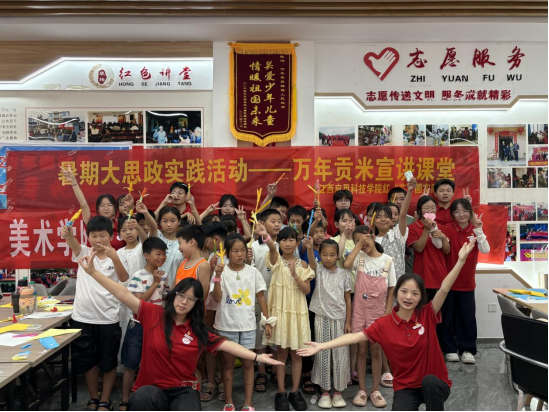 在万年县裴梅镇新时代文明实践所,实践队开展面向儿童的农耕文化传播活动。队员们精心设计了稻米手工制作课程与理论知识宣讲环节,通过趣味动画、实物展示等方式,向孩子们讲解稻米的生长过程和营养价值。在动手环节,队员们手把手指导孩子们制作麦穗工艺品,并带领大家学习《稻香》的手势舞,让农耕文化以直观、生动的方式融入儿童认知世界。