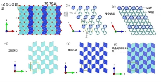 图3:谢石英的晶体结构(结构数据来源于Teter等,1998)是使用免费软件VESTA(Momma和Izumi,2011)绘制而成。(a)沿c轴观察,(b)(c)沿b轴观察,以及(d)(e)(f)沿a轴观察。(b)显示在(010)面网上sio6八面体沿[101]方向共棱连接构成折状链的排列情况。(c)显示sio6八面体链通过交替c/2平移堆叠。(a)(d)(e)中,交替平移的sio6八面体链通过角链共角顶连接形成平行于(100)方向的八面体单层(分别称si1和si2)。(f)显示si1和si2沿a轴方向交替c/2平移堆叠。