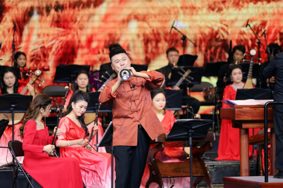 整场音乐会在节目编排上注重历史纵深与情感递进,通过一系列富有代表性的民族音乐作品,构建起一条由文明根脉通向时代精神的艺术表达路径。《庆典序曲》以恢宏热烈的旋律拉开演出序幕,奏响奋进新时代的昂扬乐章;歌曲《江西欢迎你》从“古色、红色、绿色”三个维度勾勒江西文化与时代发展的生动画卷;民族管弦乐《印象国乐·大曲》以敦煌古谱为素材,在传统与现代的交融中重现千年乐韵,展现中华优秀传统文化创造性转化、创新性发展的艺术成果;唢呐独奏《喜丰收》以质朴明快的旋律描绘劳动人民喜获丰收的生动场景,将浓郁的生活气息与昂扬向上的时代情感融入音符之中,传递出对美好生活的真切礼赞。
