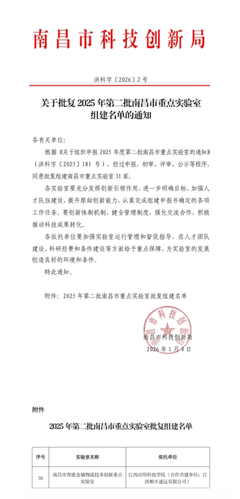 近日,南昌市科技创新局公布2025年第二批南昌市重点实验室组建名单,我校与合作共建单位江西顺丰速运有限公司联合申报的“南昌市智能仓储物流技术创新重点实验室”获批组建。
