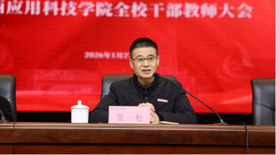 干甜常务副校长代表学校作年度工作报告,系统总结了2025年学校在党建品牌建设、审核评估迎评准备、产教融合深化、师资队伍建设、学生全面发展、办学条件改善以及校园安全稳定等方面取得的阶段性成果。着眼“十五五”时期的发展要求,对2026年学校重点改革任务作出系统部署,围绕筑牢教学质量生命线、优化学科专业结构、创新产教融合机制、推进数字化赋能转型、实施人才强校战略、提升科研工作质效等方面,明确了新一年工作重点和推进路径。