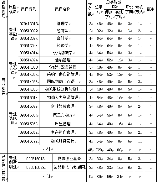管理学、经济法、会计学、经济学、物流法律法规、现代物流学、运输管理、仓储与配送管理、采购与供应链管理、国际物流(双语)、物流系统分析与设计、物流系统仿真、物流人力资源管理、企业战略管理、第三方物流、供应链协同管理。