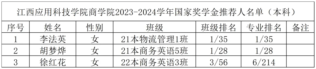 根据江西省学生资助中心和江西应用科技学院相关文件精神,现根据教育部办公厅关于进一步规范普通高校国家奖学金评审与材料填报工作的通知要求,经学生本人提交申请、班级初审、学院评审小组评审,现将2023--2024学年度江西应用科技学院商学院国家奖学金推荐人员名单向全院予以公示: