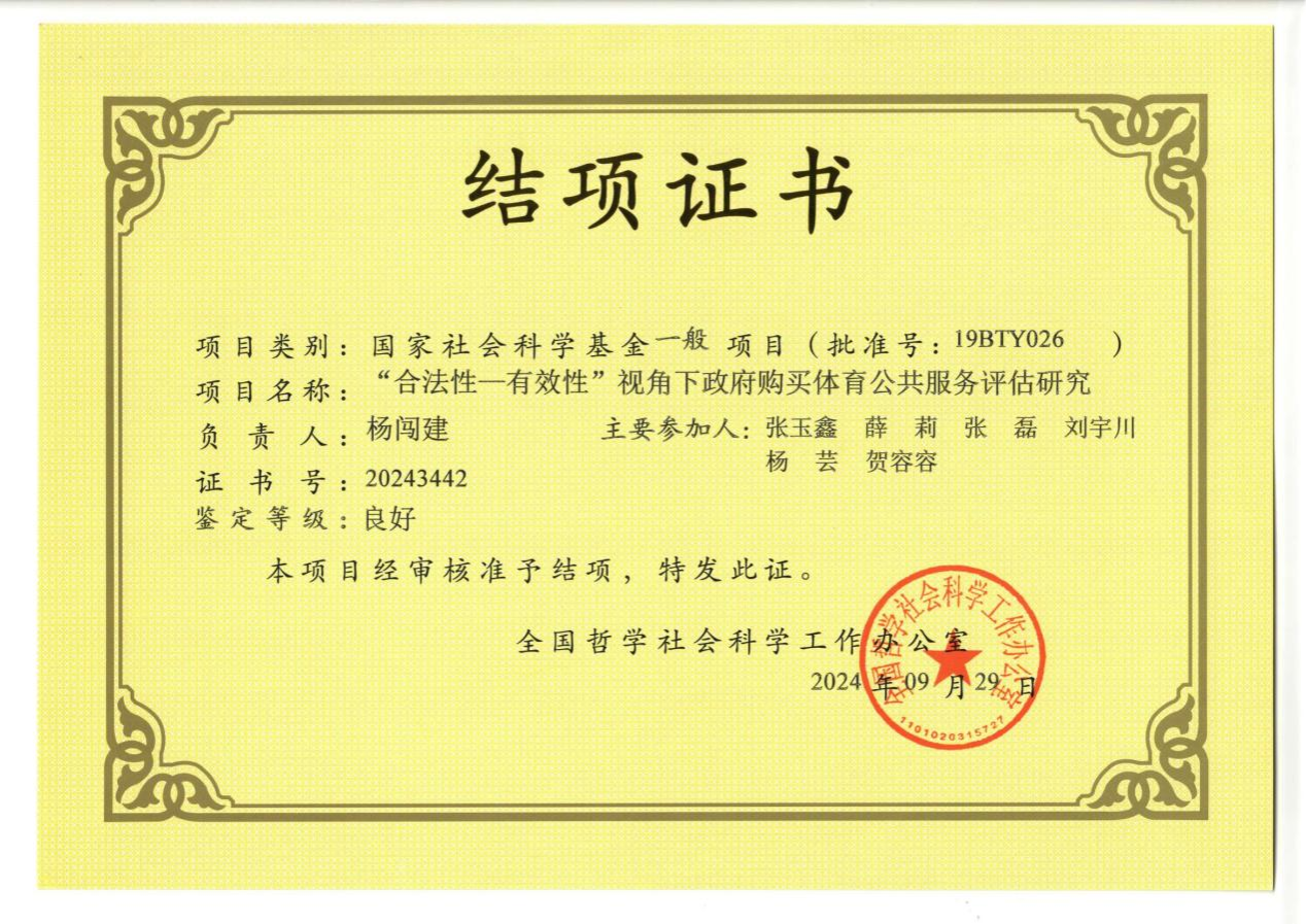 近日,由学院教师张玉鑫参与、华东交通大学杨闯建教授主持的国家社科基金一般项目(项目号:19BTY026)“‘合法性——有效性’视角下政府购买体育公共服务评估研究”以良好等级顺利结项。