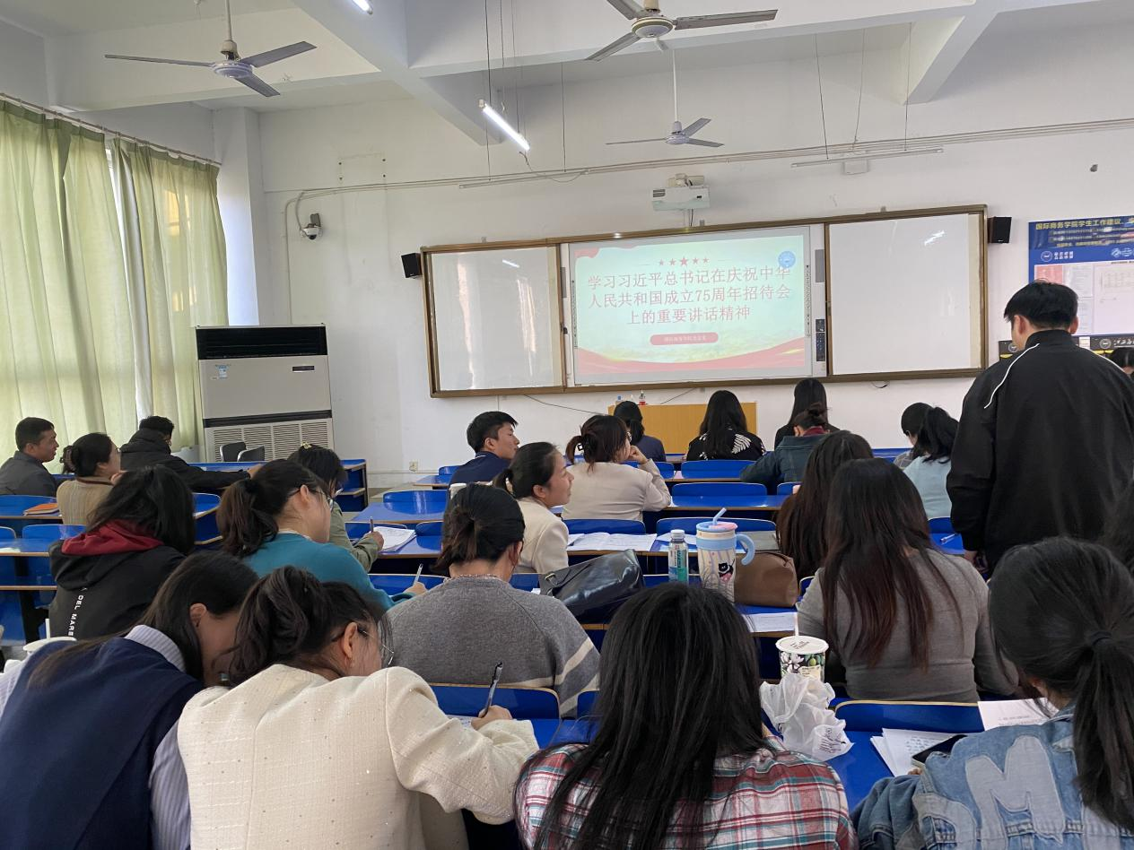 为贯彻落实习近平总书记在庆祝中华人民共和国成立75周年招待会上的重要讲话精神,深刻领会习近平总书记重要讲话精神的重大意义、丰富内涵和实践要求,2024年10月15日,商学院党总支在三达楼204教室,召开学习习近平总书记在庆祝中华人民共和国成立75周年招待会上的重要讲话精神专题学习会,商学院全体党员参与本次学习会。