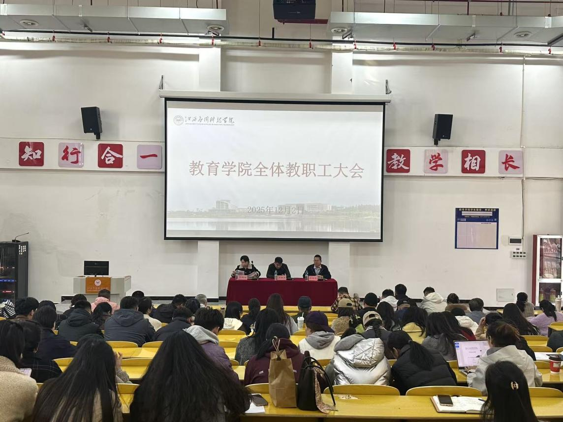 为扎实做好学期末各项工作,确保教育教学平稳有序推进,教育学院于2025年12月2日在志远楼101教室召开全体教职工会议,系统部署期末阶段重点任务。学院领导班子及全体教职工参加会议。