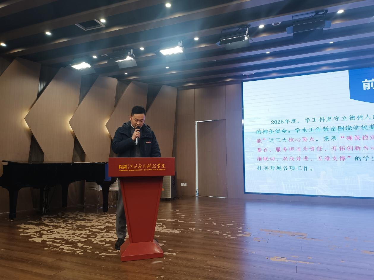 卞秀运院长对学院的教学科研、党建、学生工作成果进行了整体总结,就2026年度实习就业、产业学院建设、人工智能赋能教育教学、课程思政建设等重点任务进行了介绍,并针对2025年度全体教职工参与科研、教育质量工程、竞赛指导业绩情况,要求全体教职工认真总结业绩材料,积极参与横向课题、专业竞赛等项目,推动学院整体师资水平提升,为学院长远发展、培养高素质人才筑牢根基。