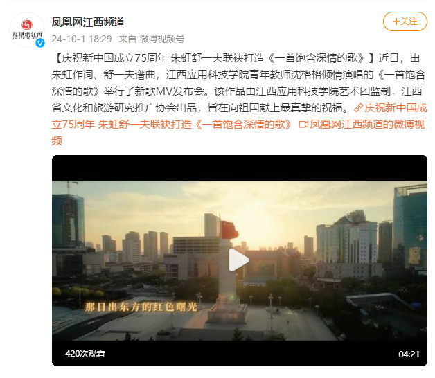 献礼新中国成立75周年,9月26日上午,由朱虹作词、舒一夫谱曲,江西应用科技学院青年教师沈格格倾情演唱的《一首饱含深情的歌》在江西应用科技学院举行了新歌MV发布会。