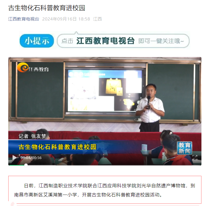 日前,江西制造职业技术学院联合江西应用科技学院刘光华自然遗产博物馆,到南昌市高新区艾溪湖第一小学,开展古生物化石科普教育进校园活动。