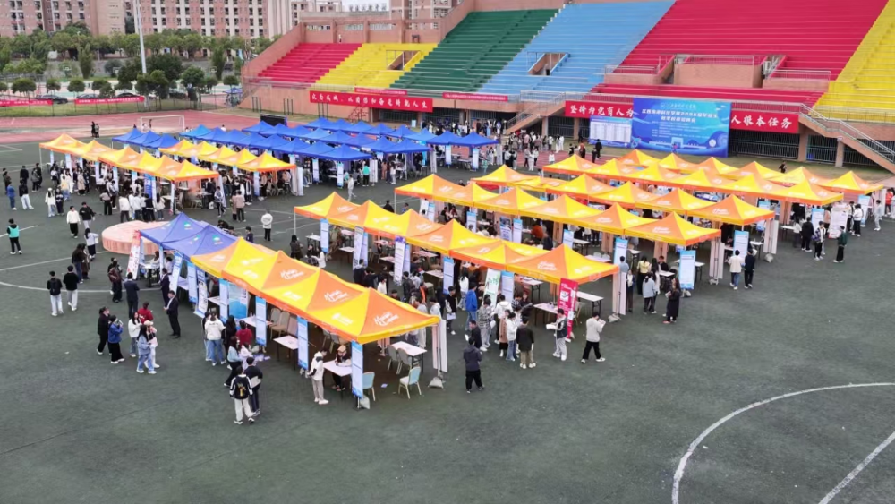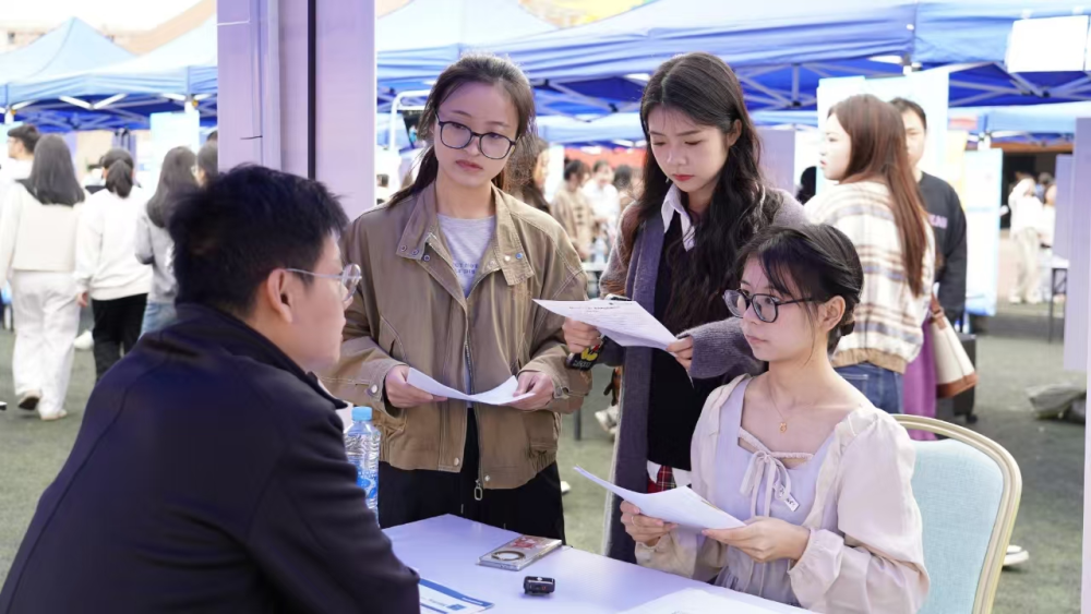 10月20日,在江西应用科技学院内,昔日宽敞的操场变成了学生“家门口”的职场。来自省内外的152家企业在操场上摆摊招聘,热闹非凡。现场,学生们拿着简历来回穿梭于各招聘展位间,咨询招聘岗位要求、企业情况和晋升空间。同时,他们也积极向企业代表展示自己的专业技能和综合素质,希望能够找到一份合适的工作。