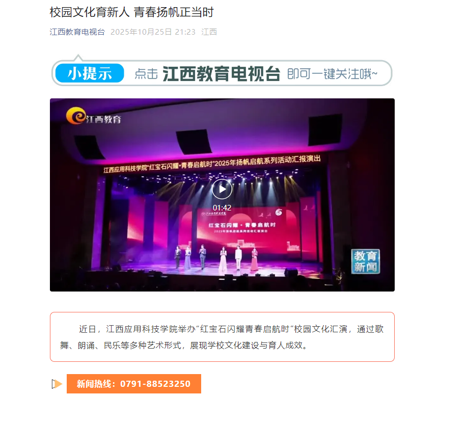 上一条:【江西教育电视台】江西应用科技学院举办2026届毕业生秋季校园双选会 | 全力以赴促就业 下一条:【江西省教育厅】中共江西省教育厅社会力量举办学校委员会召开2025年第三季度党委(扩大)会议