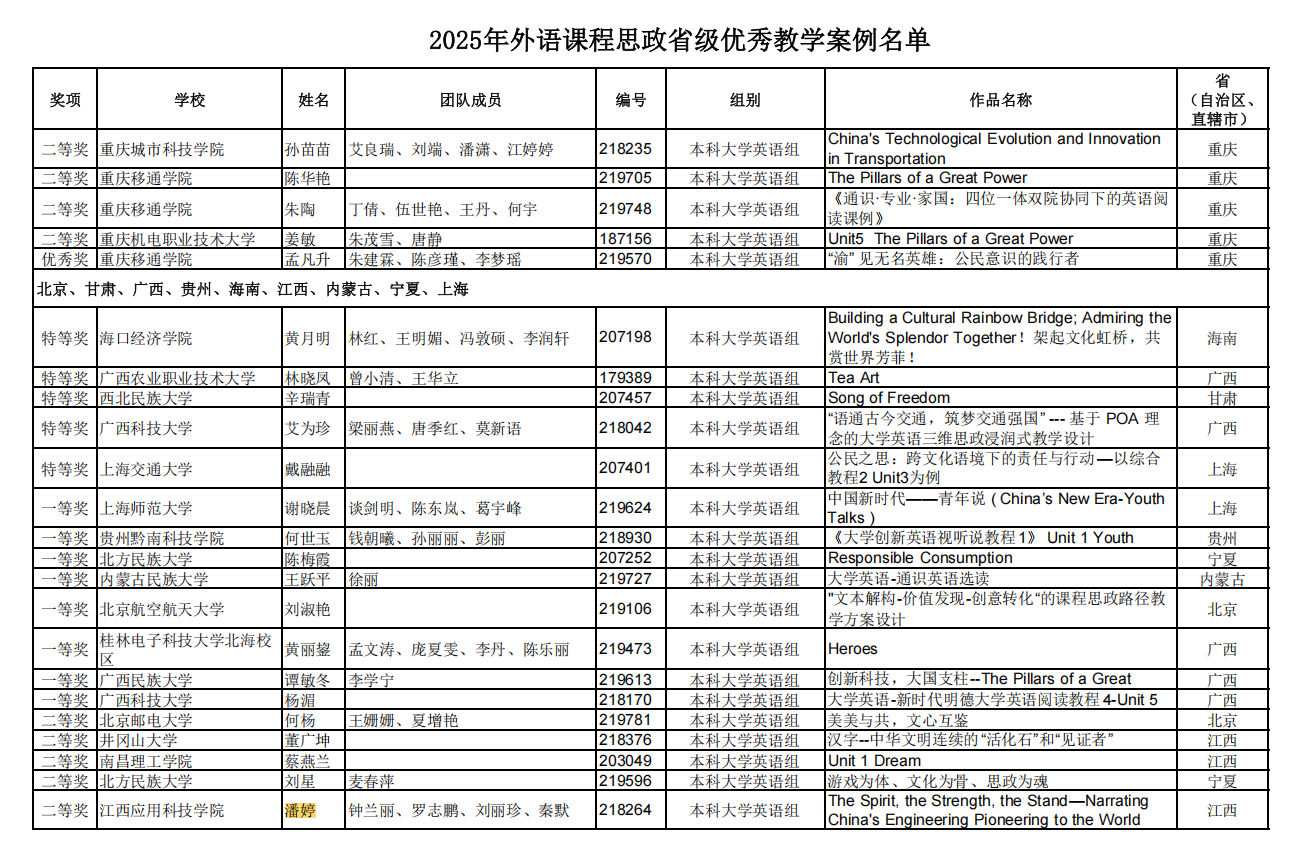竞赛以“课程思政”为核心导向,强调在外语教学中有机融入思想政治教育元素,实现价值塑造、知识传授与能力培养的多元统一。经严格评审,最终评选出一批优秀教学案例。其中,公共教学部的吴小方团队荣获高职英语组一等奖,潘婷团队斩获本科大学英语组一等奖。在后续的省级评选中,吴小方团队再获高职英语组特等奖,潘婷团队获得本科大学英语组二等奖,成绩斐然。