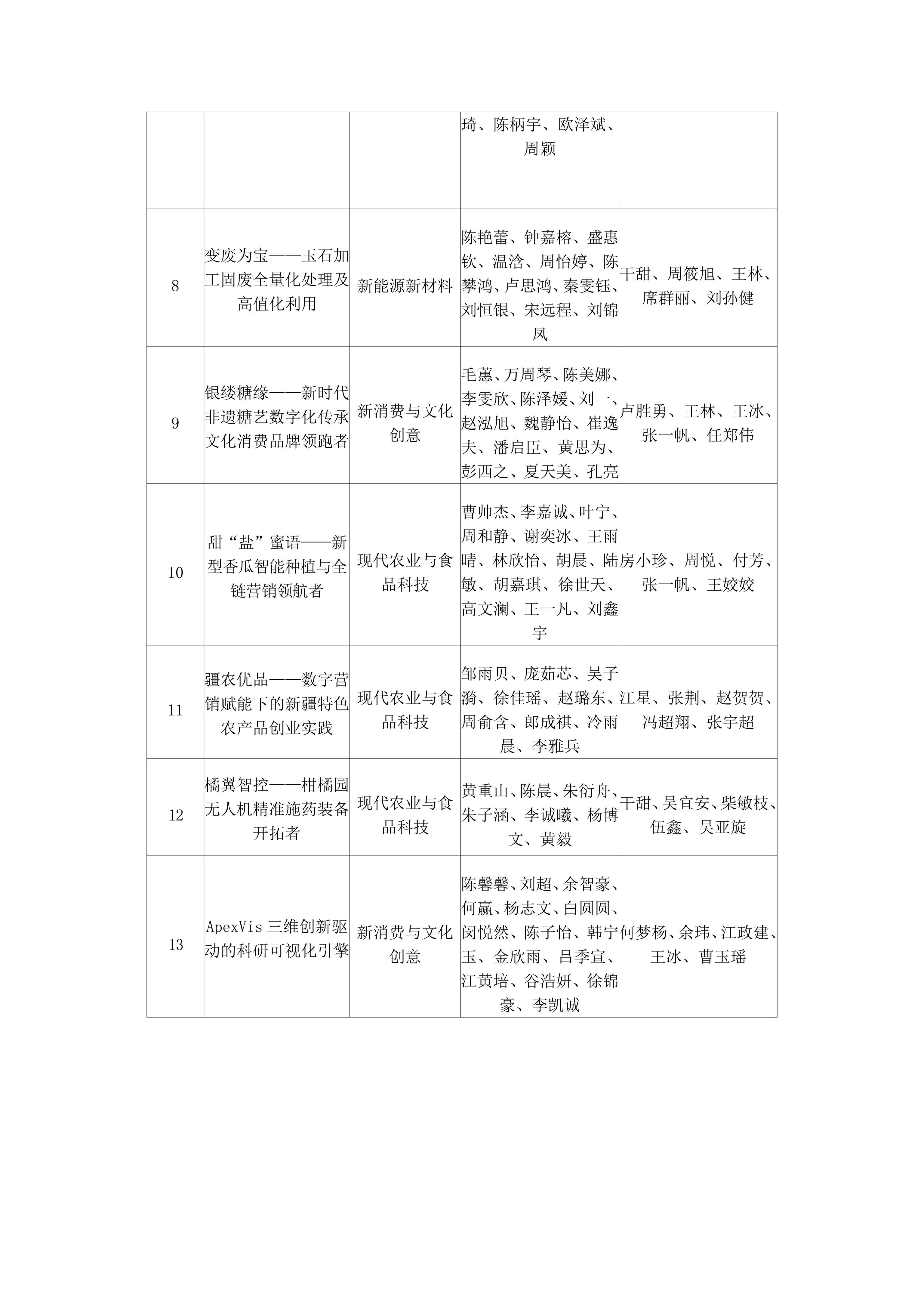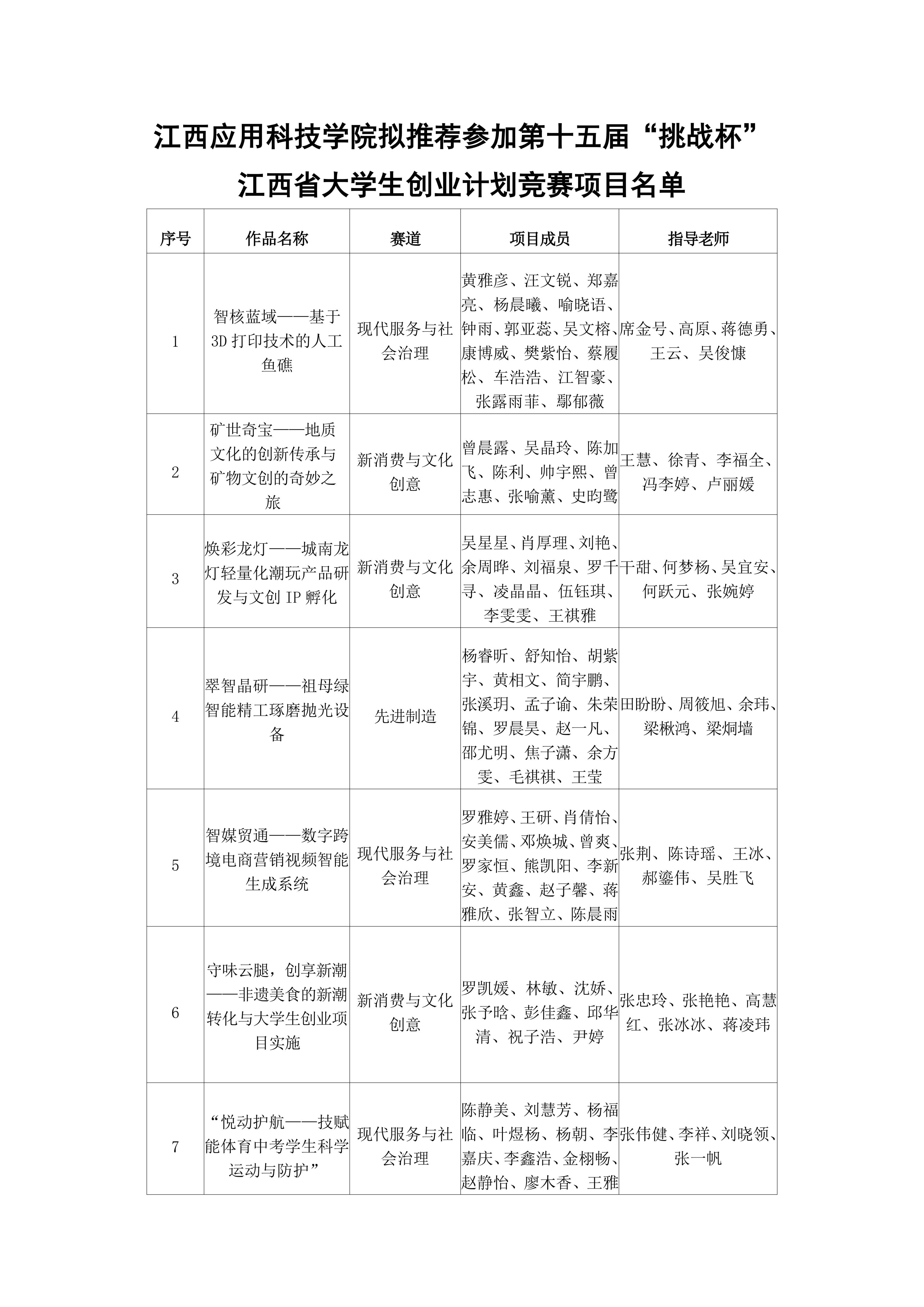 根据《关于举办第十五届“挑战杯”江西省大学生创业计划竞赛的通知》《关于举办江西应用科技学院第十五届“挑战杯”大学生创业计划竞赛的通知》等相关文件要求,经过校内选拔、校外专家评审,现拟推荐下列13件作品参加第十五届“挑战杯”江西省大学生创业计划竞赛。