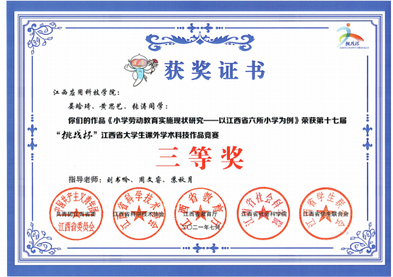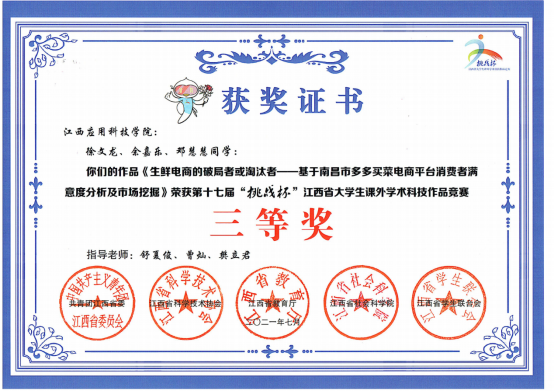 2021年于4月7日完成了校级决赛,共有503件作品,参与学生4126人,52件作品入围校级复赛,25件作品入围校级决赛,10件作品代表江西应用科技学院参加省赛。入围答辩作品1件,授予三等奖的6件。