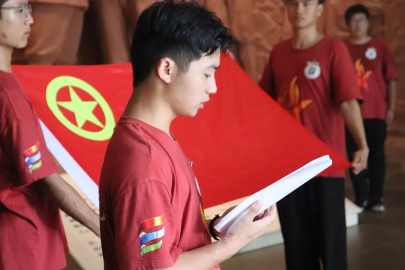 队员陈科艺带领大家重温入团誓词,他面对团旗,庄重宣誓:“我志愿加入中国共产主义青年团,坚决拥护中国共产党的领导,遵守团的章程,执行团的决议,履行团员义务,严守团的纪律,勤奋学习,积极工作,吃苦在前,享受在后,为共产主义事业而奋斗!”