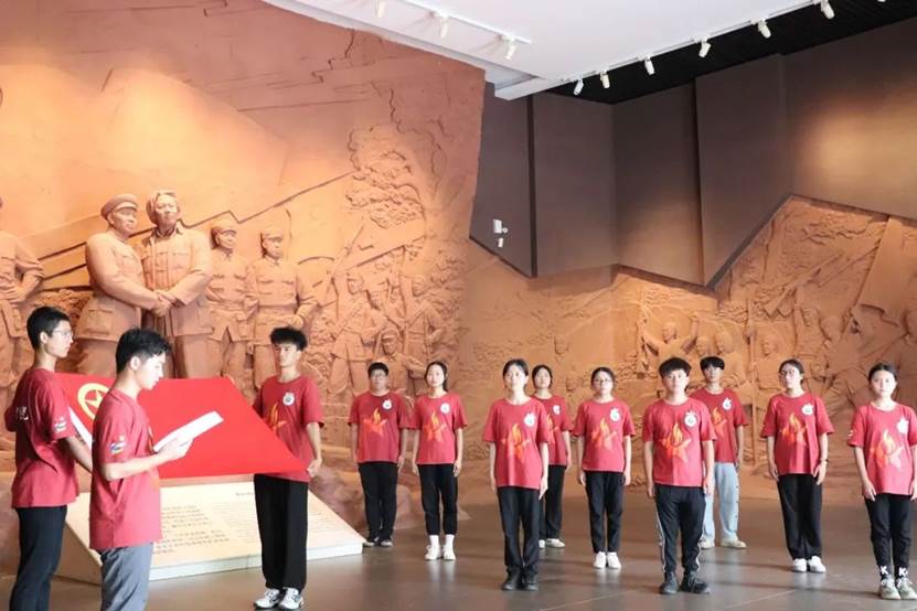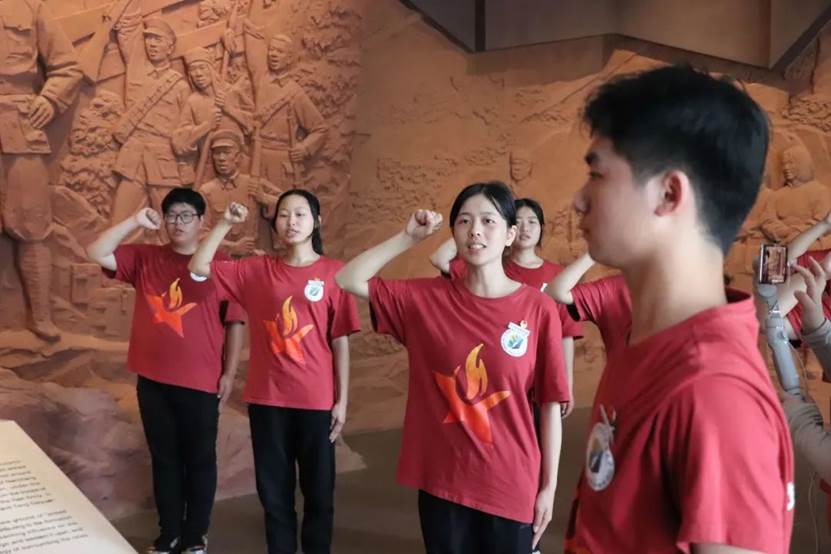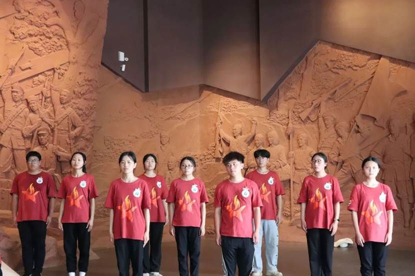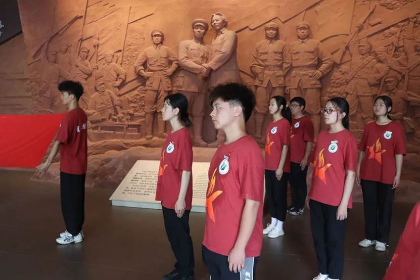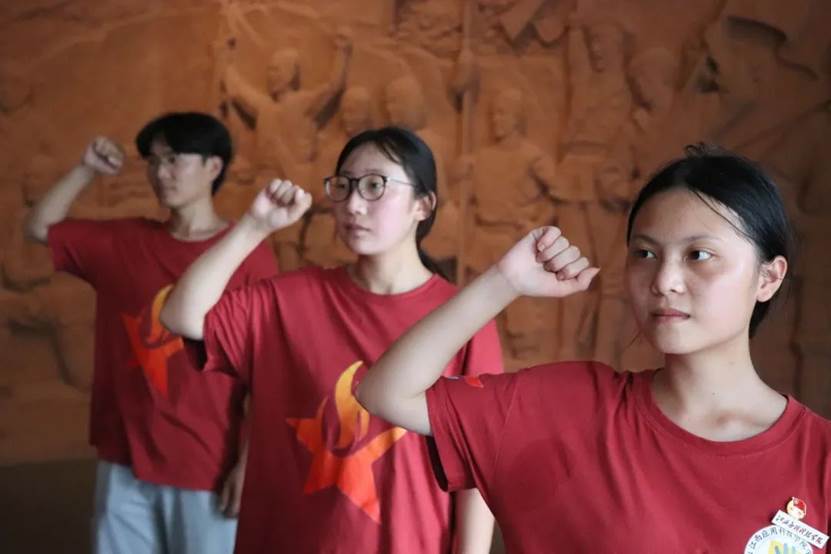 在井冈山会师纪念馆前,“星火逐光队”队员重温入团仪式,仪式由江西应用科技学院执行主席方羽杰主持,由实践队队员代表陈科艺发言,他表示“作为一名共青团员要勇于承担责任,履行义务,听从党的指挥,积极做好党的助手和后备军。二十大来临之际,我们也将紧跟党的步伐,向着新征程迈进。积极配合党的工作,共同建设现代化社会主义强国。为共同建设现代化社会主义强国贡献一份自己的力量。”