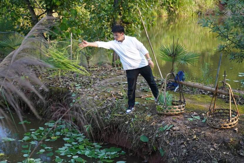 此外,实践队员还前往林地帮助收割农户种植的“鱼饲料”,通过1小时的采摘,实践队集满了两担“鱼饲料”,其挑至鱼塘,进行投喂。