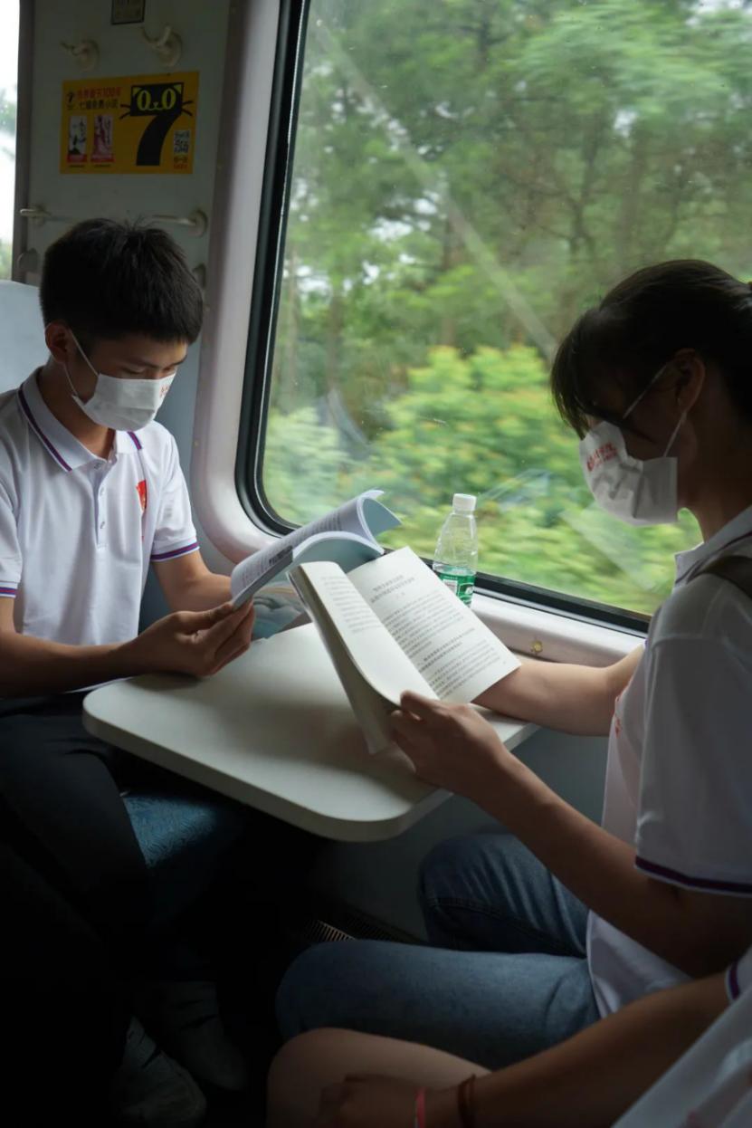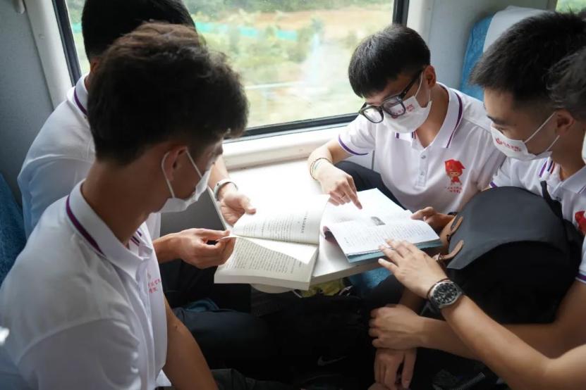在列车上,队员们了解着兴国的风土人情、发展历史,一起探讨兴国的红色乡土文化,为实践活动做着最后的准备。