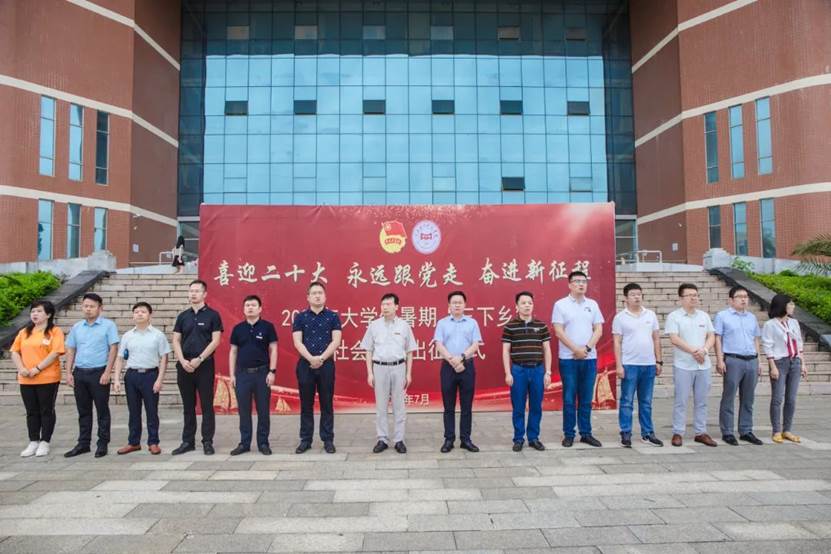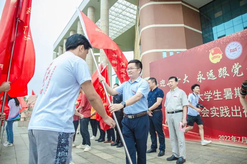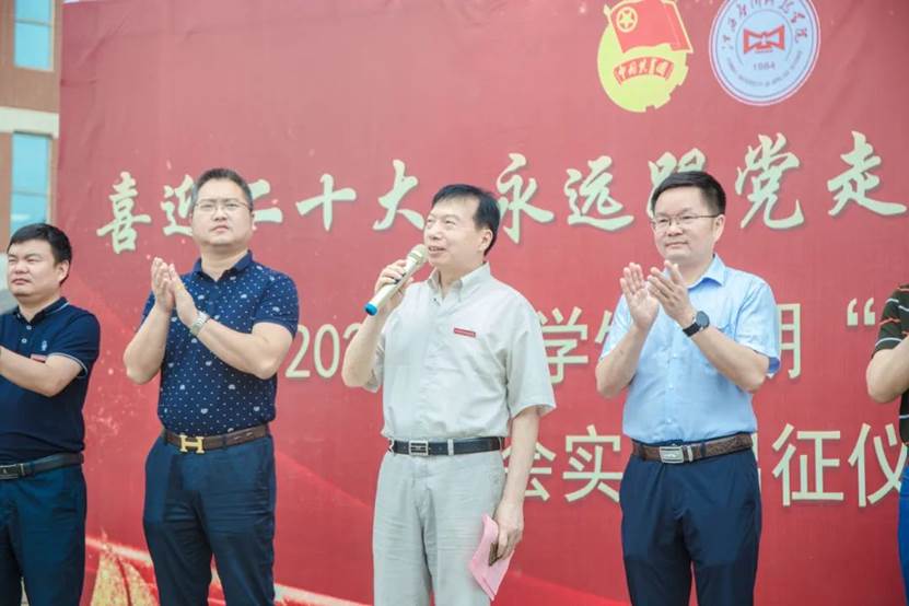 6月20日上午,学校举行“喜迎二十大 永远跟党走 奋斗新征程”2022年大学生暑期“三下乡”社会实践活动出征仪式。校长黄士安出席并讲话,副校长刘春斌为实践团队授旗,学工处处长黎晓明布置实践安全工作,各学院党总支书记、团总支书记,实践团队师生共计200余人参加出征仪式。