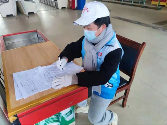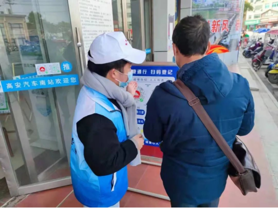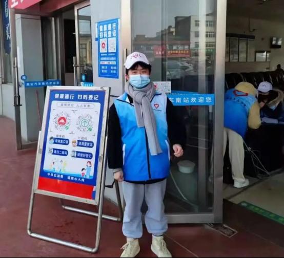 在防疫大旗指引之下,况成同学来到汽车站协助工作人员进行疫情防控,引导咨询,维护秩序等志愿服务,缓解高峰期人满为患的防疫压力,悉心引导弱势群体做好相关扫码登记工作。