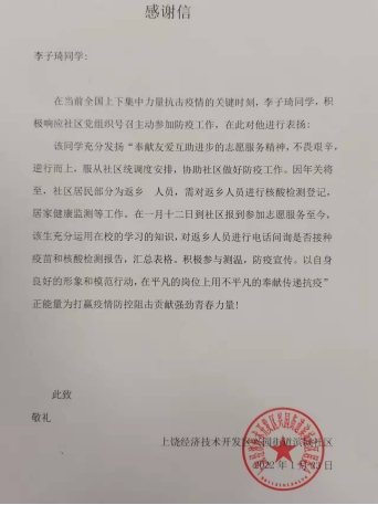 在全国抗击疫情的关键时刻,李子琦同学在回到家后,便积极响应社区党组织号召,主动参与防疫工作。