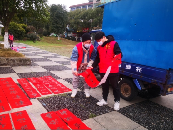 (对春联进行分工,整理,晾干)
