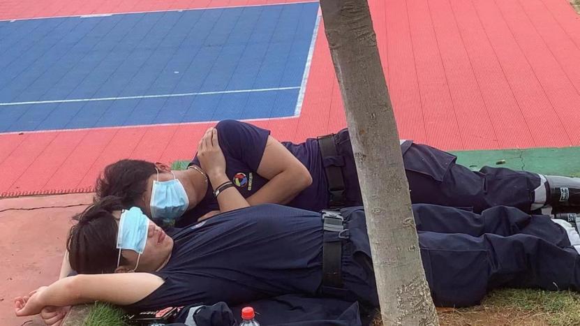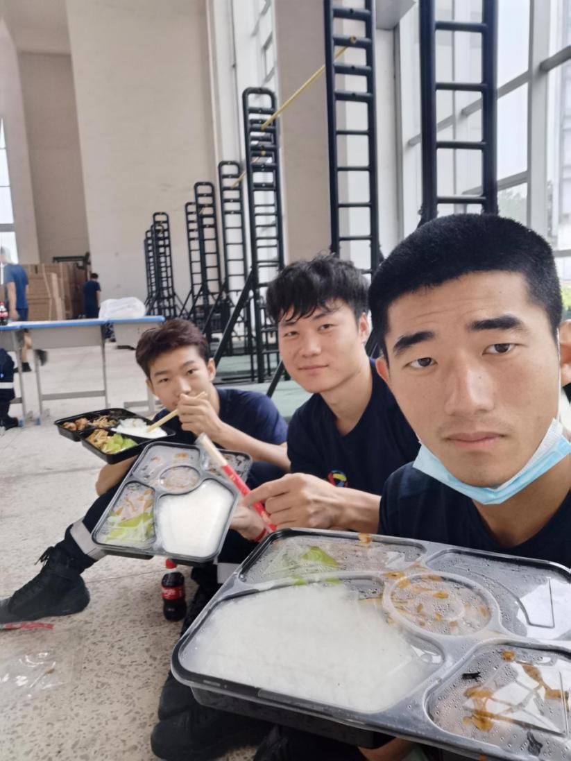 在外条件艰苦,他们也总是能找到克服的方法。“以天为盖地为庐”,草地也是他们临时休息的地方。永远保持一颗充满希望,昂扬向上的心,保持艰苦朴素的作风,即使是简单的盒饭也能吃出大餐的感觉。