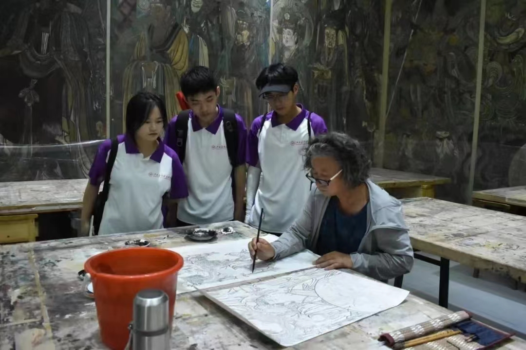 (图为观察团成员观赏永乐宫临摹老师临摹壁画)