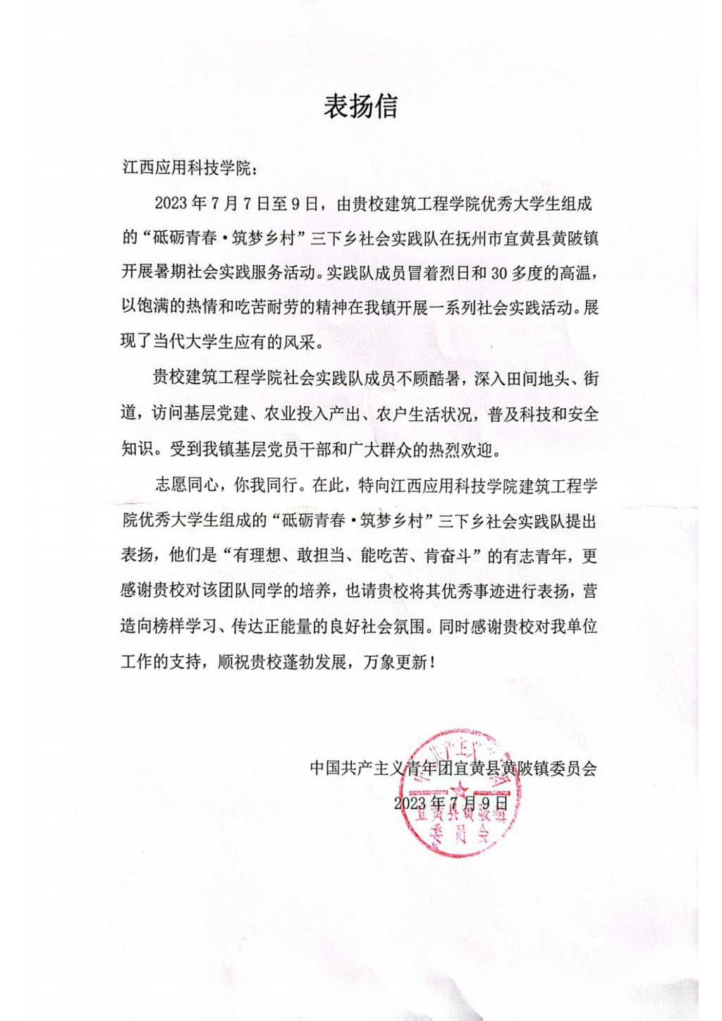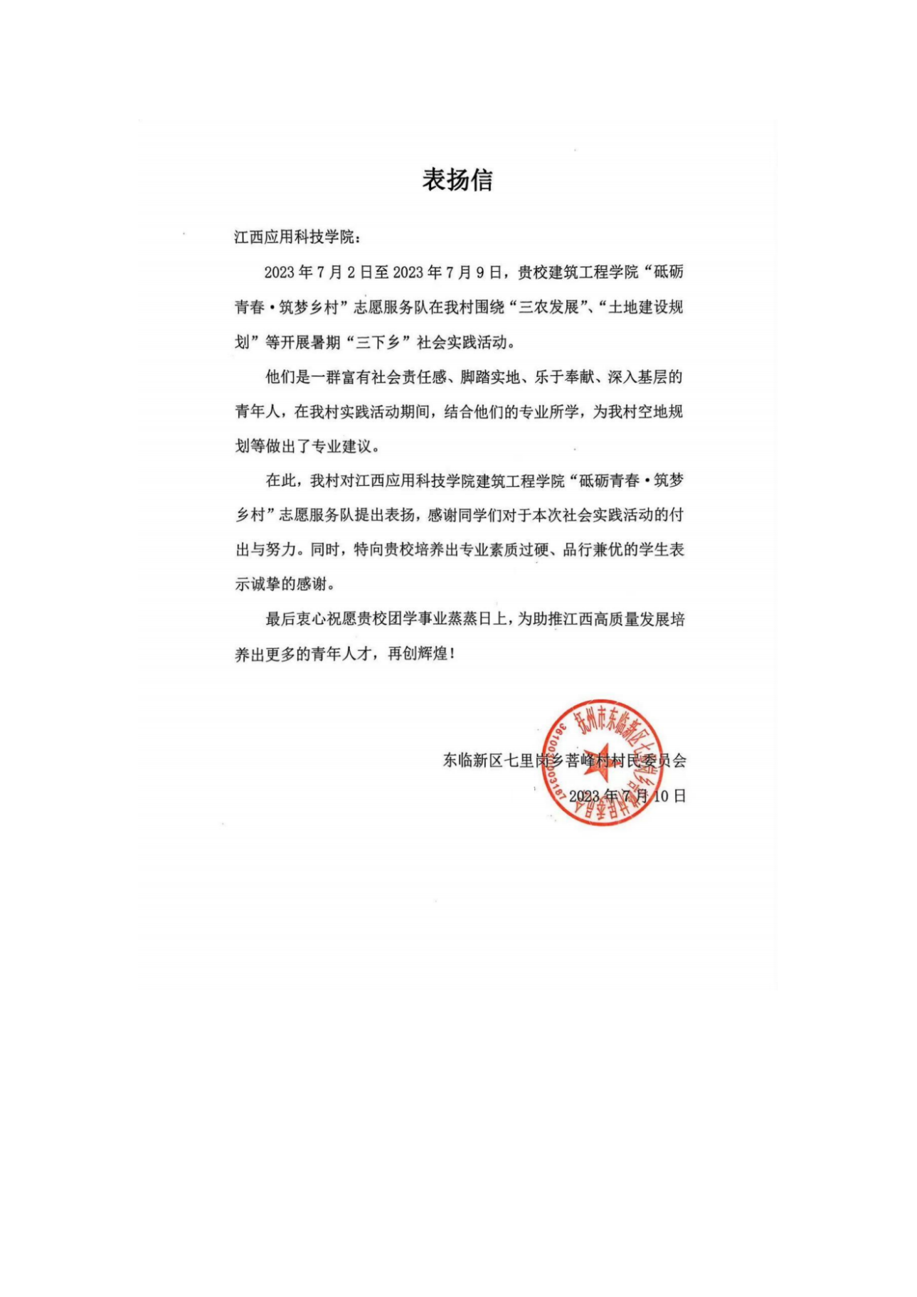 抚州市东临新区七里岗乡普峰村村委会和抚州市宜黄县黄陂镇团委分别给江西应用科技学院建筑工程学院“砥砺青春·筑梦乡村”三下乡社会实践队提出表扬:
