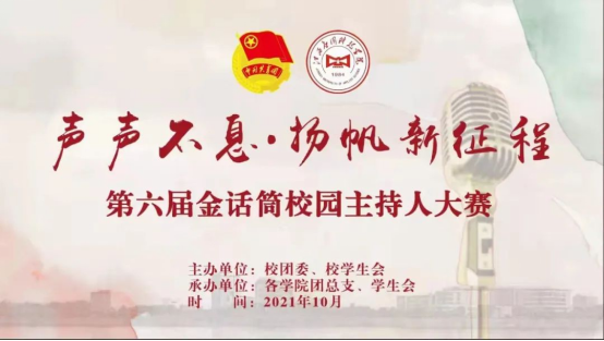 为庆祝中国共产党成立100周年,深入学习贯彻习近平新时代中国特色社会主义思想和习近平总书记“七一”重要讲话精神,激发全体师生的爱国热情。为给同学提供锻炼自我、展现自我的平台,不断提高自身综合素养,展现当代大学生积极、热情、富有活力的青春风采,特此举办“声声不息·扬帆新征程”第六届金话筒校园主持人大赛。