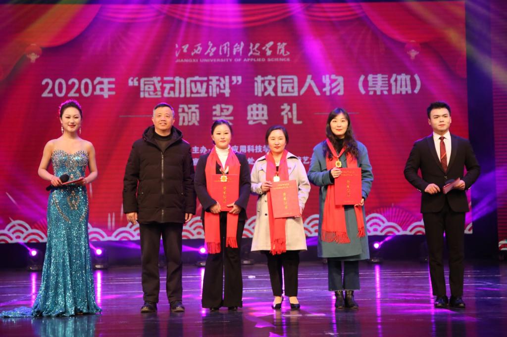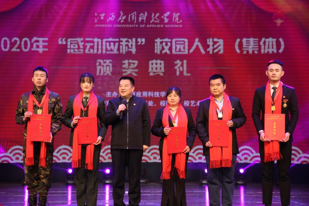 颁奖典礼回顾了在2020年上演的一桩桩至善至美,感动人心的事迹。在2020年新冠疫情防控战斗中,我校师生主动“出列”,投身疫情防控各类志愿服务活动的抗“疫”师生代表张伟健、郭新巧、黄浩斌,抗疫夫妇瞿振东、李雅琴;在学校“三元育人”理念的浸润下,始终以优秀共产党员为指引,积极向党组织靠拢,立足专业基础、刻苦钻研职业技能,心怀感恩之心,投身文明志愿实践的江西省最美大学生李艾玲;走出学校,走向社会,走向基层,用双手助力乡村发展,用心灵关怀留守儿童,用头脑为当地学校和政府献计献策的童趣童团队、“美丽中国我是行动者”社会实践调研团、返乡推普·语你相约社会实践队;投身于学校教学科研工作,扎实的开展教育科研工作的王慧、魏雅姝、胡灵芝;踏实肯干求务实的后勤工作人员徐银苟;经过180天艰苦奋斗,在2020年全国大学生机械创新设计大赛的舞台上,克服重重困难,斩获全国一等奖的获奖团体以及在学习上孜孜以求的自强之星集体。获奖者一一走上颁奖台,一个又一个感动你我的故事激荡着在场观众的心灵,大家以热烈的掌声向他们致以最崇高的敬意。他们的事迹让大家在感动中汲取奋发向上的力量,让平凡的生命有了厚度与广度,让感动与向上的种子播撒活动现场,在应科人的心中生根发芽。
